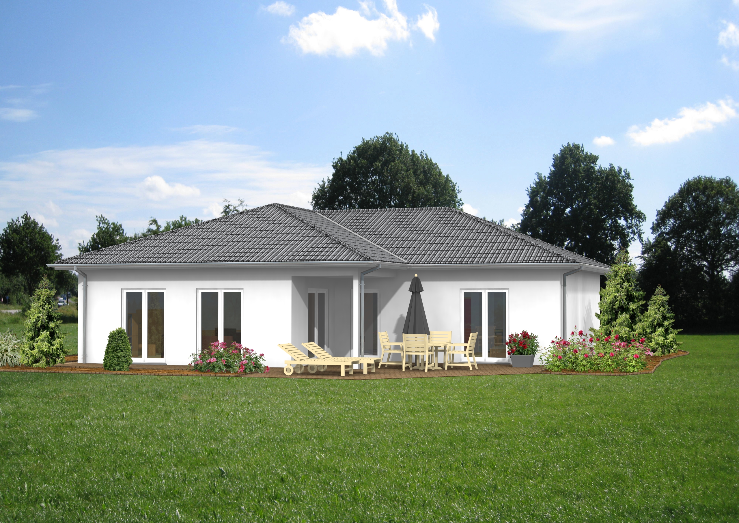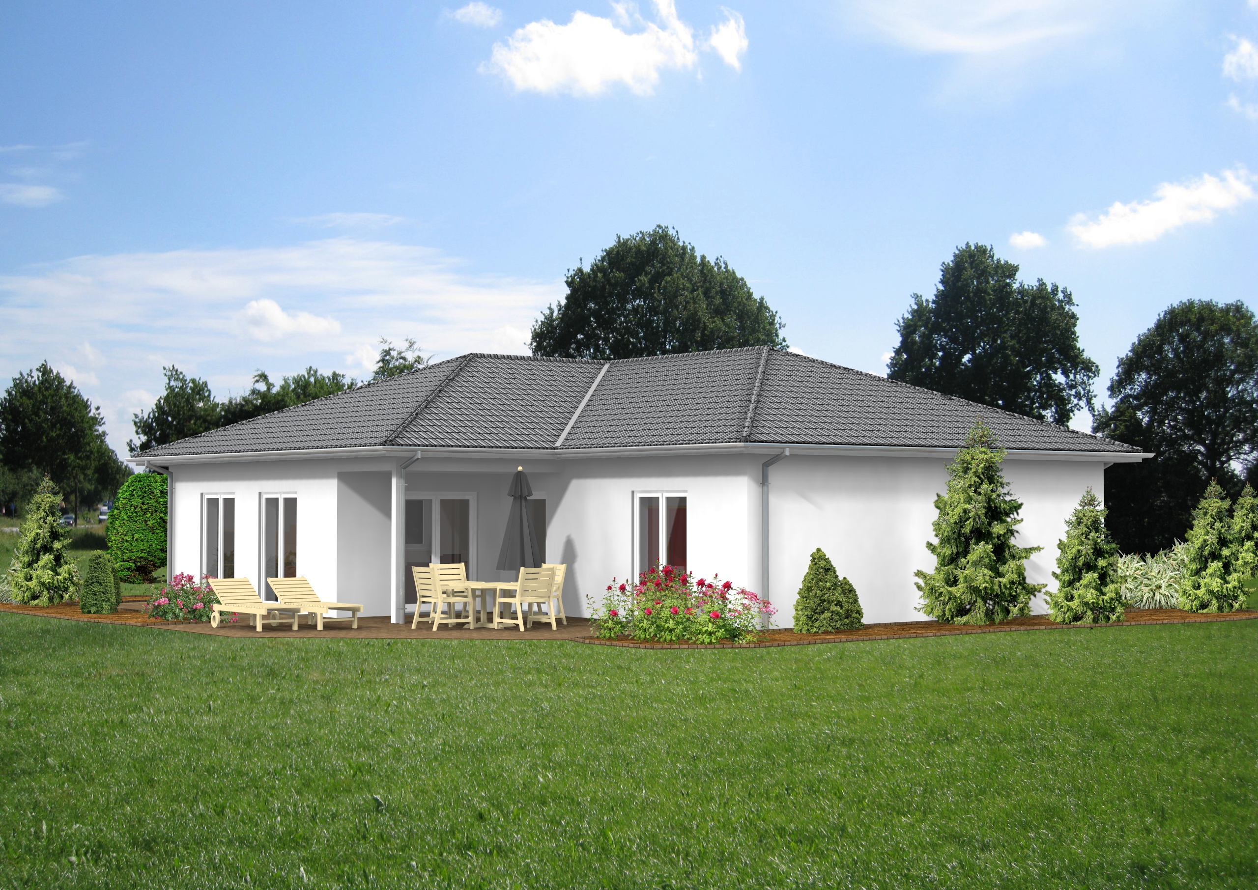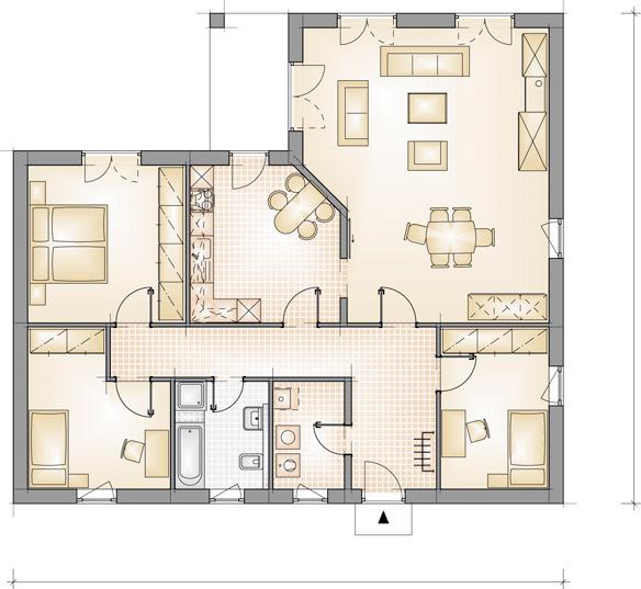 Behagliches Wohnen auf einer Ebene: Dieses eingeschossige Haus ist ideal für Singles oder Familien, deren Kinder bereits eigene Wege gehen. Es erinnert an einen komfortablen Bungalow im Süden. Kurze Wege, eine geräumige Küche mit direktem Zugang zum groflen, hellen Wohnzimmer. Und natürlich fehlt auch das Gästezimmer nicht.